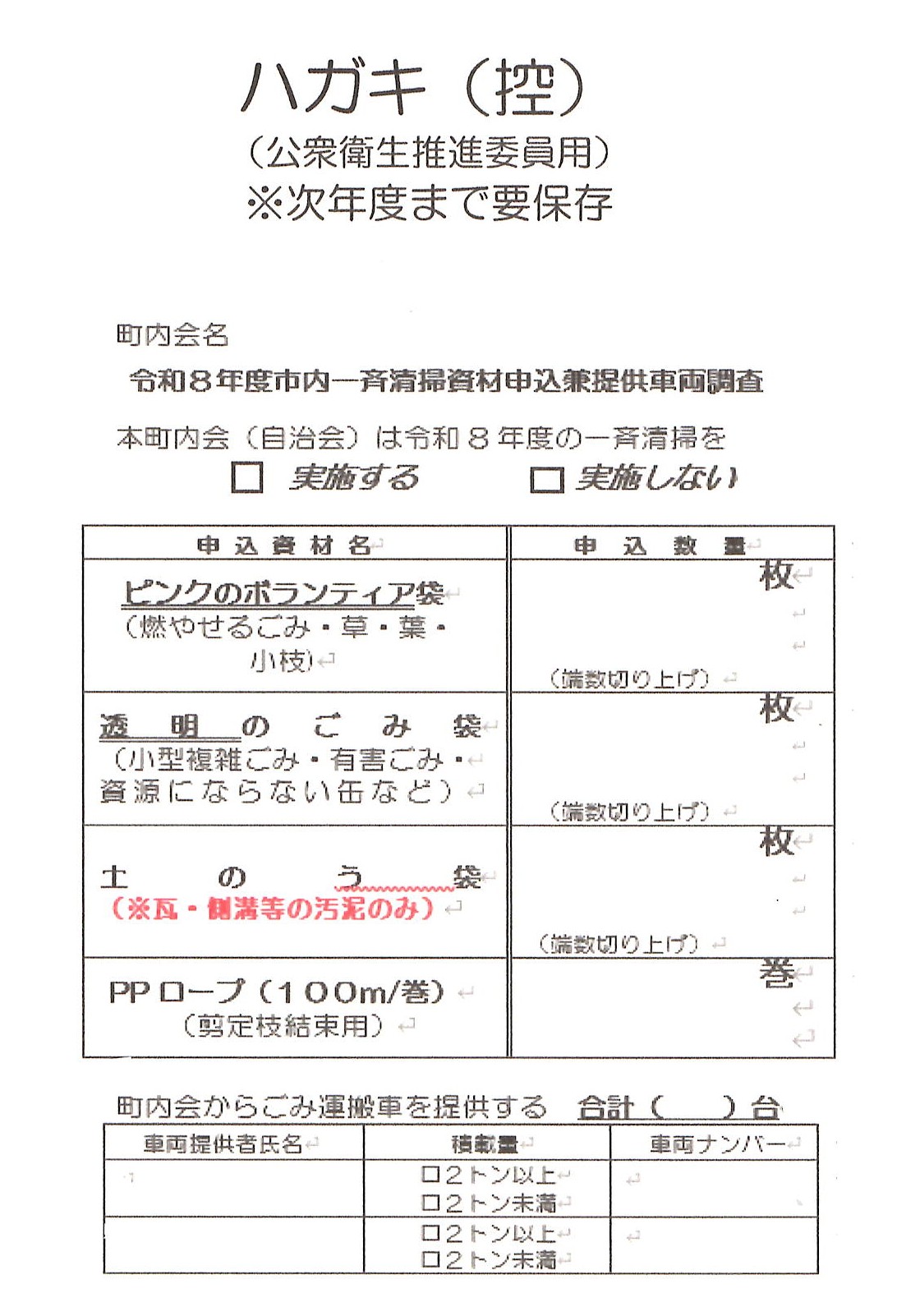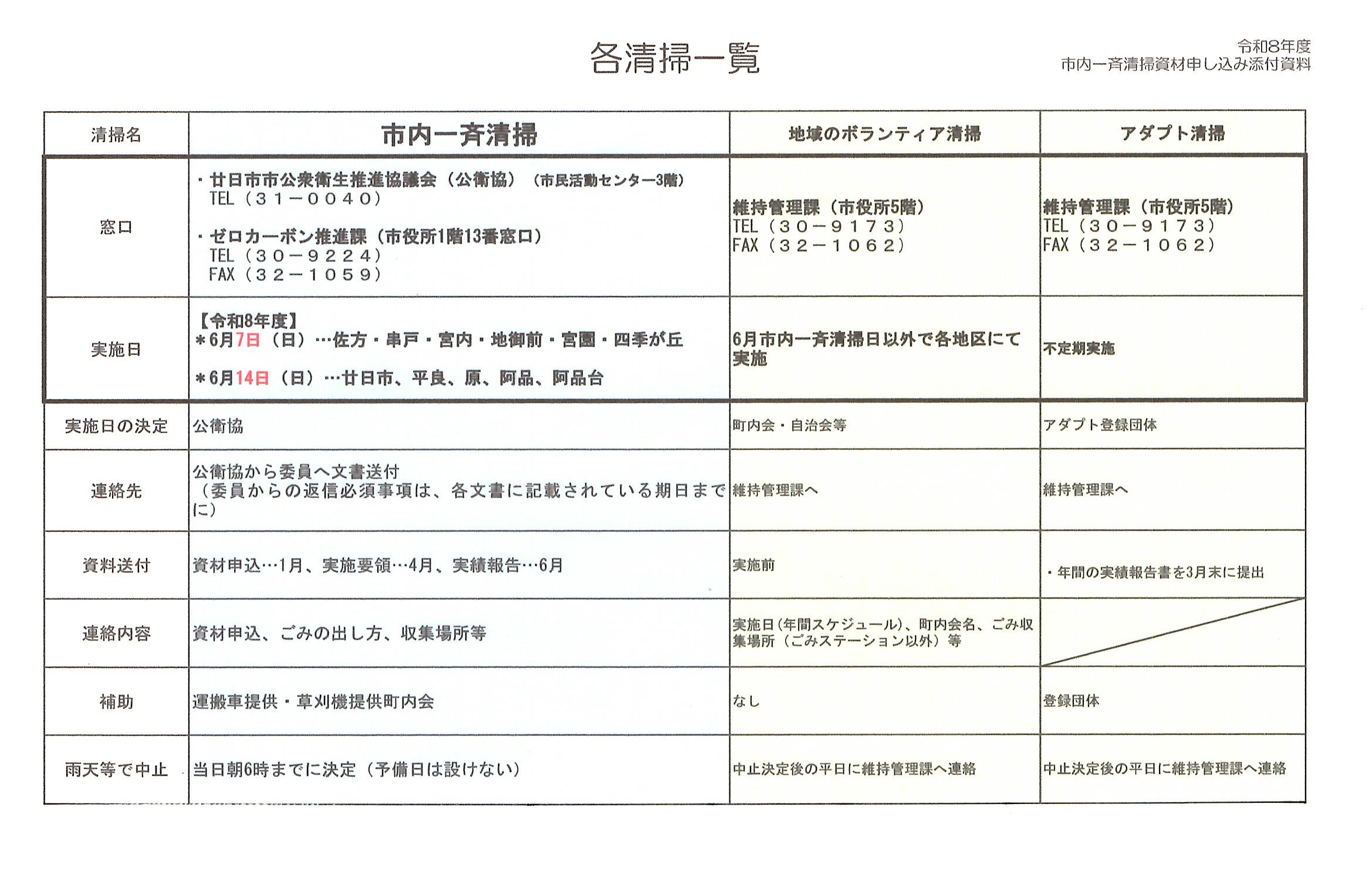 令和8年度市内一斉清掃送付資料の訂正について 令和8年1月22日付で発送した資材申し込みの書類について、一部訂正および資料の封入漏れがありましたので、お知らせします。 ⓵訂正「各清掃一覧表」清掃の日付 6月1・8日→6月7・14日 画像参照 ②封入漏れ「ハガキ(控)」画像参照 上記2点につきましては、3月3日発送予定の「アルゼンチンアリ防除薬剤の注文について」の書類に同封させていただきます。大変ご迷惑をおかけし申し訳ございません。よろしくお願いします。